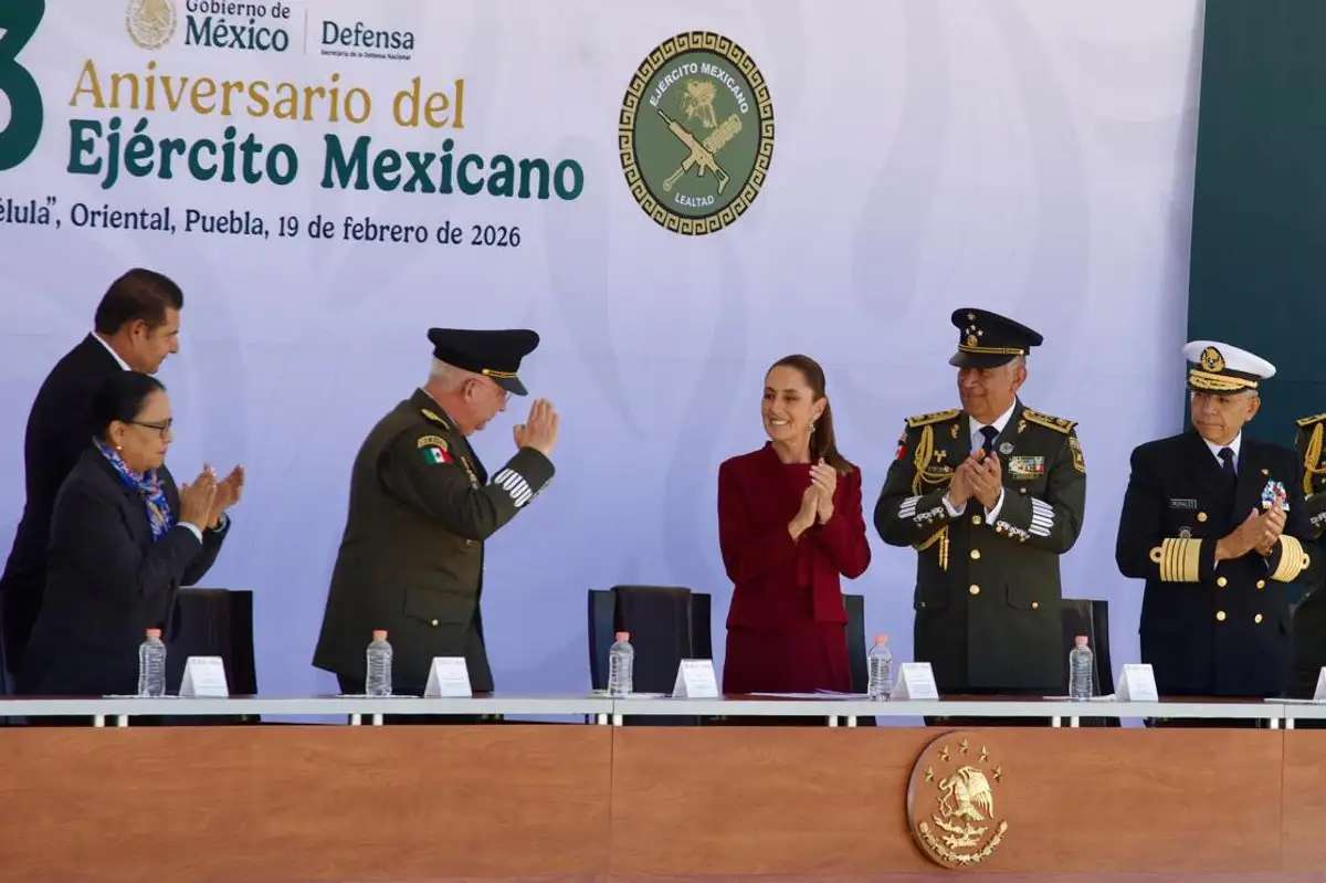 La mandataria, estuvo acompañada en el presidium por los secretarios de la Defensa Nacional, general Ricardo Trevilla; y de Marina, Reymundo Morales; altos mandos de las fuerzas armadas; la secretaria de Gobernación, Rosa Icela Rodríguez; y el gobernador de Puebla, Alejandro Armenta.