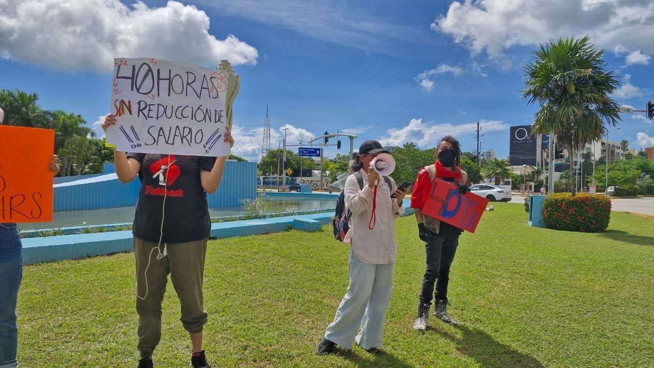 Un grupo de manifestantes se congregó esta mañana en la glorieta conocida como “El Ceviche”, ubicada sobre la avenida Tulum, para sumarse a la protesta convocada a nivel nacional para exigir la aprobación de la iniciativa que busca reducir la jornada laboral de 48 a 40 horas semanales.