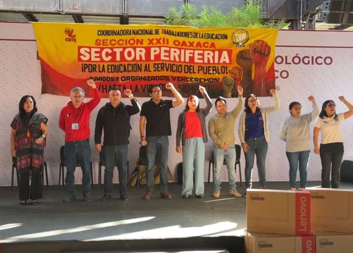 Profesores de la sección 22 de la Coordinadora Nacional de los Trabajadores de la Educación (CNTE) protestaron previo a un acto oficial que encabezó el gobernador del estado, Salomón Jara Cruz, en el que se realizó la entrega de equipo tecnológico a escuelas de nivel básico; los mentores puntualizaron que estas herramientas son logros que la lucha magisterial a arrebatado con sus movilizaciones al gobierno de la presidenta, Claudia Sheinbaum y no una bondad del gobierno de Jara Cruz.