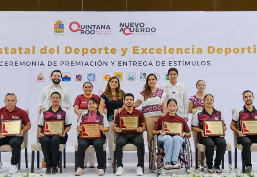 En el Centro Internacional de Negocios y Convenciones de Chetumal, Mara Lezama entregó reconocimientos a los ganadores del Premio Estatal del Deporte 2025: Andrés Dupont Cabrera, en la categoría de Deportista Convencional; Lya Daniela Sánchez Tadeo, Deportista Adaptado; Carlos Alberto Matos Zavala, entrenador de Levantamiento de Pesas; Yasmín Hernández Varela, entrenadora de Paradanza Deportiva; y la profesora Georgina Tatiana Roque Roque, Fomento Deportivo.