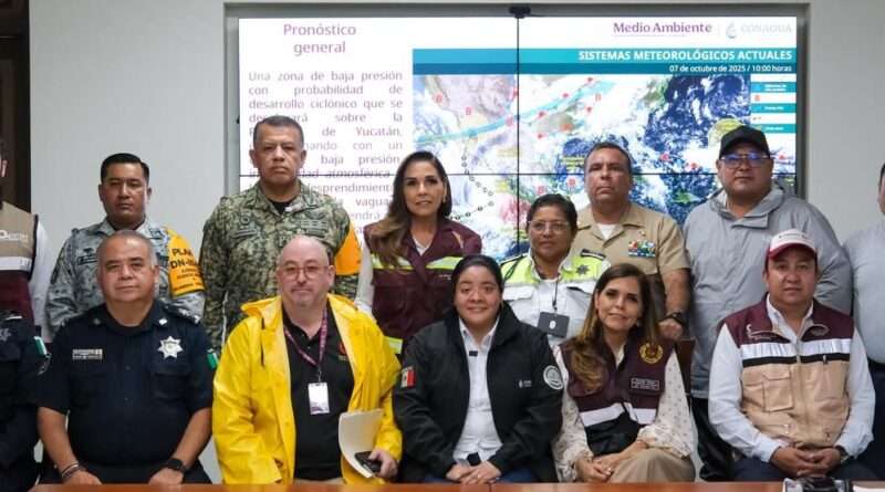 La gobernadora Mara Lezama Espinosa realizó una visita de supervisión al Puesto de Mando instalado como parte del seguimiento a una zona de baja presión que se desplaza sobre la Península de Yucatán e interactúa con un canal de baja presión.