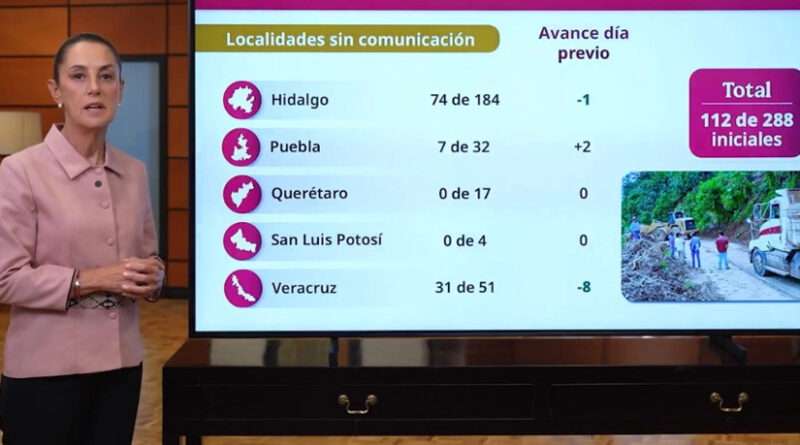 Refirió que aún se mantienen 112 pequeñas localidades a las que no hay manera de llegar vía terrestre: 74 en Hidalgo , siete en puebla y 31 en Veracruz.
