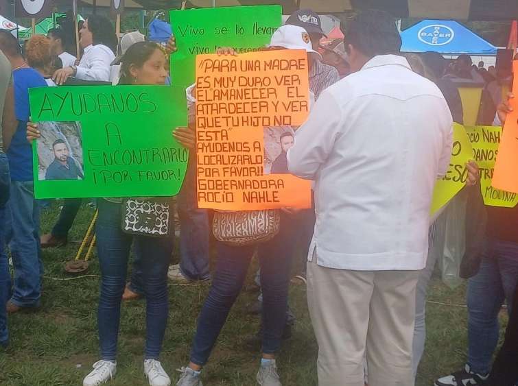 Familiares, amigos y compañeros de trabajo del joven desaparecido Sergio Molina Jiménez, se manifestaron durante un evento de la gobernadora Rocío Nahle Garcia, para exigir su localización con vida lo antes posible.