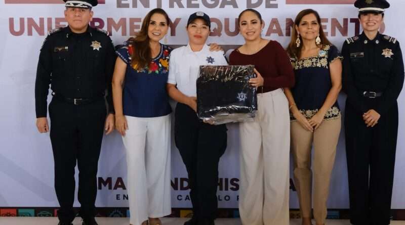 La gobernadora Mara Lezama Espinosa acompañó a la presidenta municipal de Felipe Carrillo Puerto, Mary Hernández, en la entrega de uniformes al personal operativo de Seguridad Pública, Tránsito y Bomberos del municipio, como parte de las acciones para fortalecer la dignidad y profesionalización del servicio público.