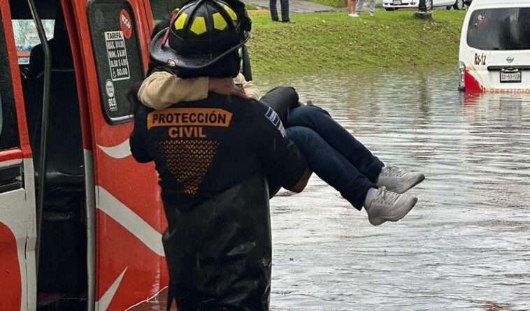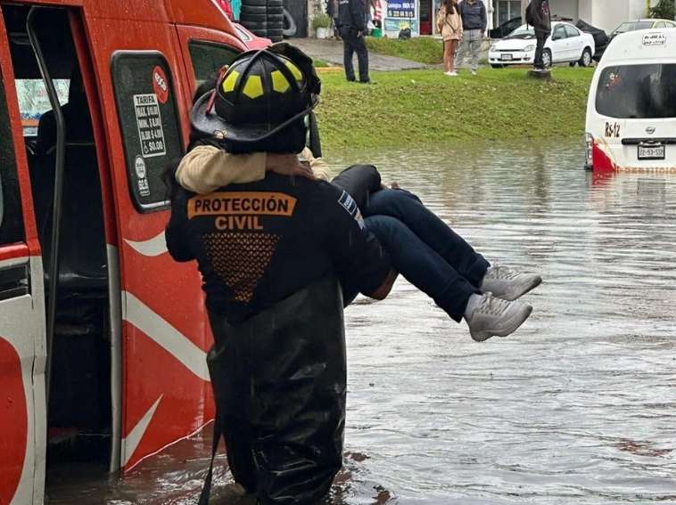 Rescatan a usuarios de transporte en Puebla atrapados en inundaciones