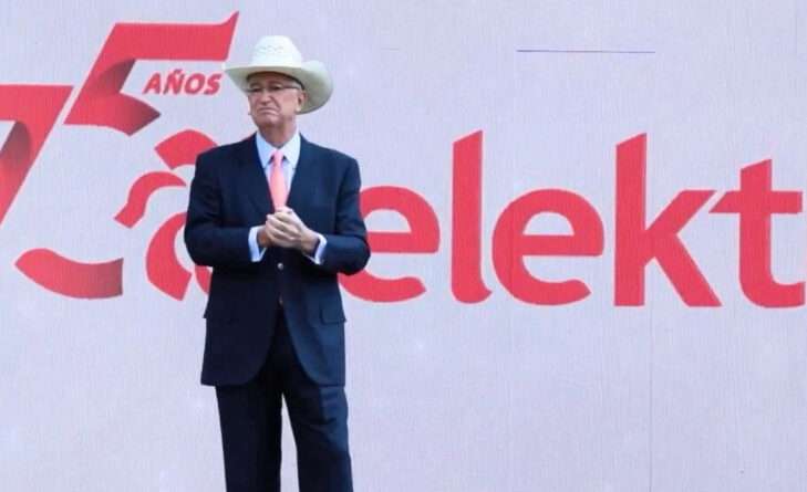 Con sombrero blanco, similar al que usaba Manzo, y al que el empresario se refirió en una publicación de redes sociales como «el muerto», Salinas Pliego lanzó un mensaje desde un templete con el nombre de la minorista como telón de fondo.
