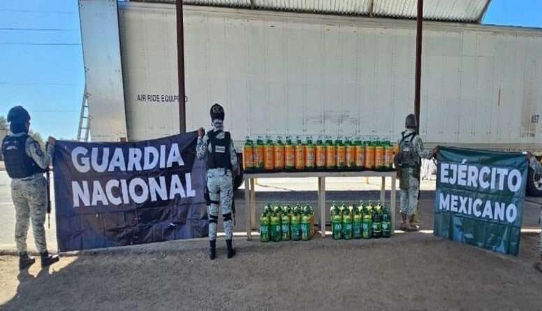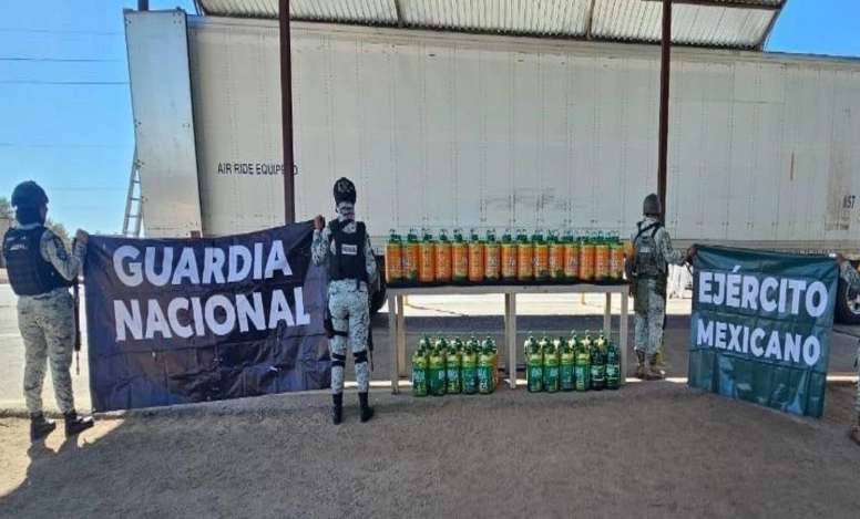Un cargamento de mil 71 litros de metanfetamina líquida, distribuido en 120 garrafones, fue asegurado por elementos del Ejército Mexicano y la Guardia Nacional durante un operativo conjunto en el Puesto Militar de Seguridad Regional “Estación Doctor”, ubicado en San Luis Río Colorado, justo en la frontera que divide México de Estados Unidos.